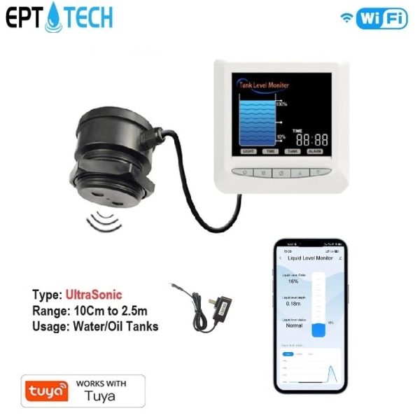 The EPT-TLC2326LS-RS Ultrasonic Water Level Sensor is a smart monitoring device designed to measure water or oil tank levels. With WiFi connectivity and Tuya compatibility, it allows real-time tank monitoring through a smartphone.