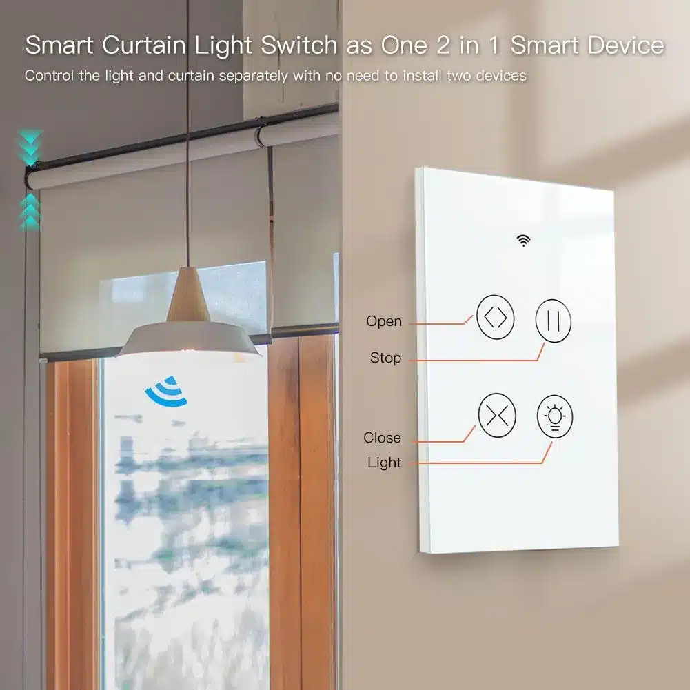 Control your curtains and lights from one stylish switch. The MOES WiFi Curtain Light Switch combines WiFi + RF433, app remote control, voice control (Alexa & Google), and a durable glass panel design