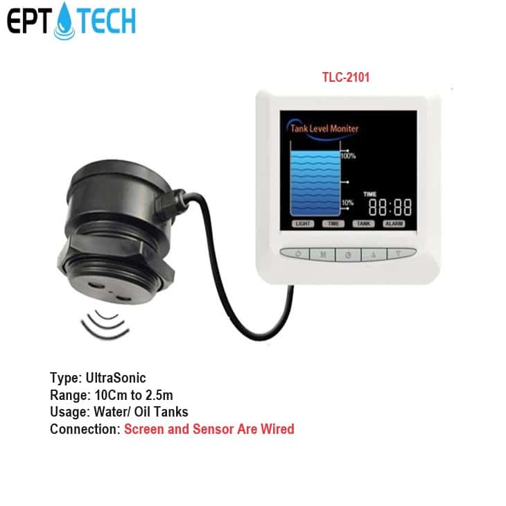 The TLC-2101 sensor is a wired ultrasonic tank level monitor with integrated display and precise level detection capabilities. Designed for use in water, oil, and chemical tanks, this sensor combines reliability with visibility, making it ideal for professional tank monitoring setups.