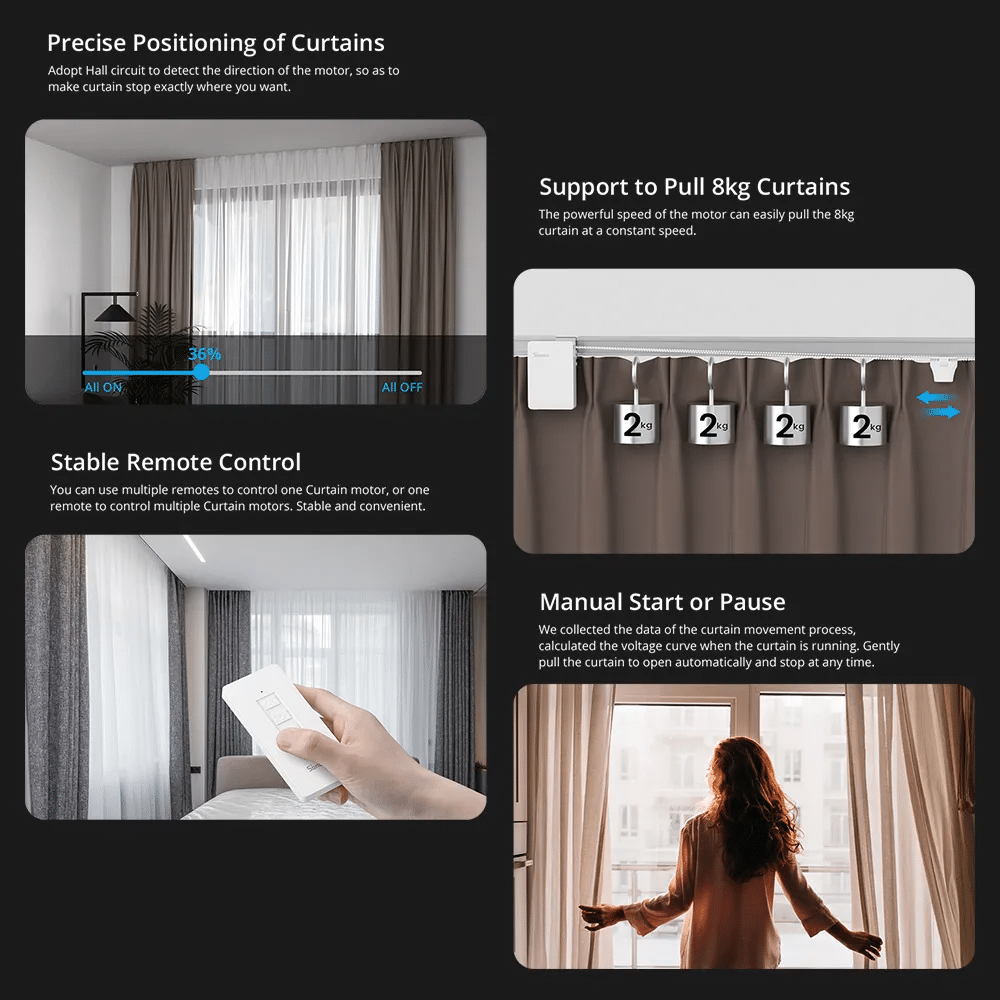 【Easy to Make Ordinary Curtain Smart】Make your original curtains smart in seconds without making any changes to your current curtain or using any tools, the powerful speed of the motor can easily pull the 8kg curtain at a constant speed.