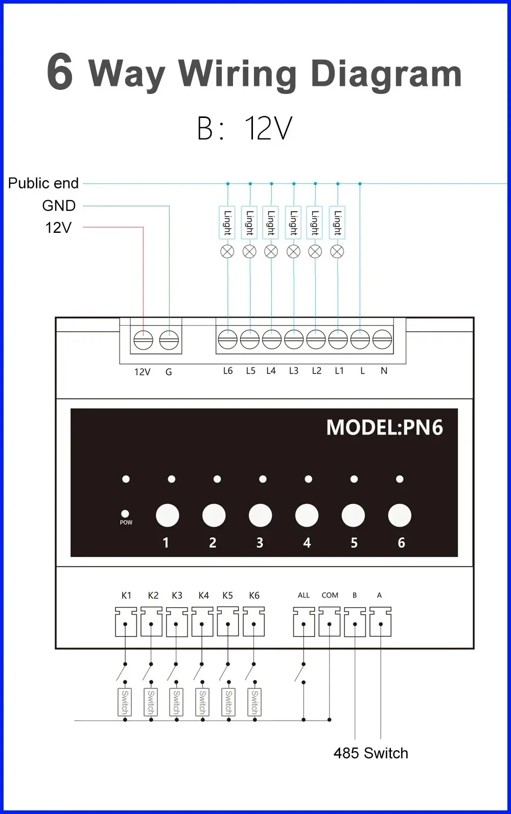 Tuya WiFi 6 channel relay controller wiring diagram RS485